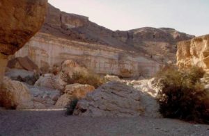 A la fin de l’ère Secondaire, durant les dernières périodes du Crétacé, il y a un peu moins de cent millions d’années, la mer de Thétys recouvre encore la totalité de la Palestine; c’est alors que selon le cycle habituel de la lithogenèse (formation des roches), les sédiments arrachés, en particulier par l’érosion, aux reliefs déjà émergés des régions voisines, se déposent au fond de la mer et constituent sous l’action combinée des éléments chimiques tenus en dissolution dans l’eau et les pressions exercées par les couches nouvelles de sédiments, les différents calcaires qui formeront plus tard l’essentiel de l’arête centrale: cénomaniens et turoniens (qui parfois sont devenus dolomitiques par leur forte teneur en carbonate de magnésium) et sénoniens, mêlés d’argile tendre.