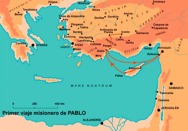 Desde entonces, Pablo lleva ese mensaje de salvación “hasta los confines de la tierra”. Sube a Antioquía de Siria, capital entonces de la provincia romana de Asia, una ciudad muy populosa – tenía alrededor de 500.000 habitantes –, una ciudad cosmopolita donde había surgido muy pronto una comunidad cristiana, en la que los creyentes de origen pagano eran más numerosos que los provenientes del judaísmo. La presencia de Bernabé, enviado por la iglesia de Jerusalén, confiere a la comunidad de Antioquía su autenticidad. Luego de pasar un año en Antioquía, Pablo junto con Bernabé parte rumbo a Chipre y de allí se dirige a Asia – es decir a Asia Menor con sus diversas provincias.