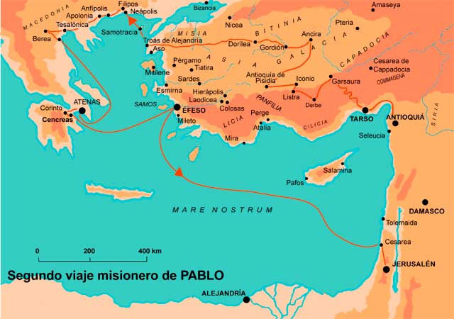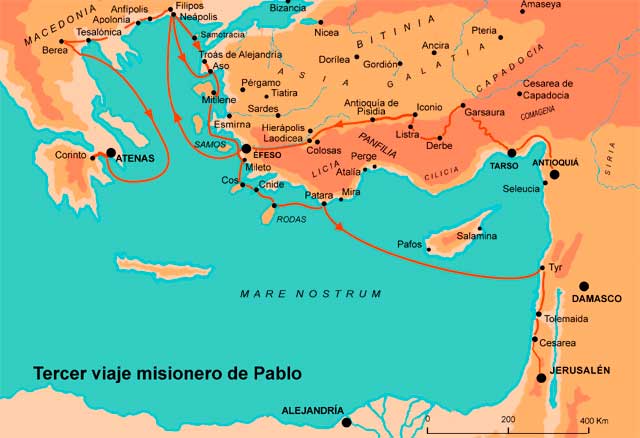Pablo recorre el territorio de este a oeste en tres ocasiones, prolongando dos veces su viaje misionero hasta Grecia.