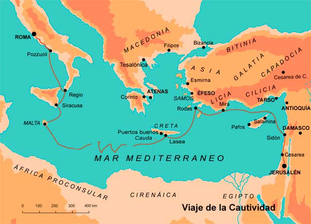 Detenido en Jerusalén, Pablo es conducido ante el procurador romano en Cesarea marítima, y después de haber apelado al emperador, en virtud de su calidad de ciudadano romano, llega a Roma, como prisionero, en el año 63.