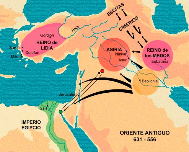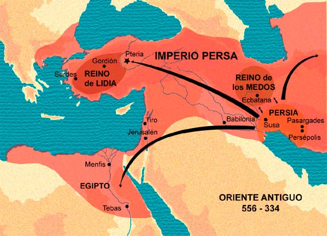 El rey Nabónida, hijo de Nabudoconosor, se dejó llevar por sus caprichos de coleccionista, llegando hasta saquear los templos malquistándose así con su propio pueblo. Tuvo sin embargo la suficiente lucidez para captar el peligro que representaba a sus espaldas el imperio de los medos. No dudó pues en favorecer la rebelión de Ciro, rey de los Persas y vasallo de los medos. Al cabo de varios años de rebelión (556-550), el joven príncipe venció a Astiages, rey de los medos. Preocupado por su éxito, Creso rey de Lidia, célebre por su fabulosa riqueza, cometió el error de atacar a Ciro. Sufrió una gran derrota y tuvo que entregar su reino al persa. Con algunas nuevas victorias al este de su reino, Ciro tuvo en su mano el Asia Menor y la totalidad de la meseta iraní. Los judíos desterrados en Babilonia percibieron en esos trastornos políticos una señal anticipada de su liberación: el fin del imperio babilonio estaba próximo.